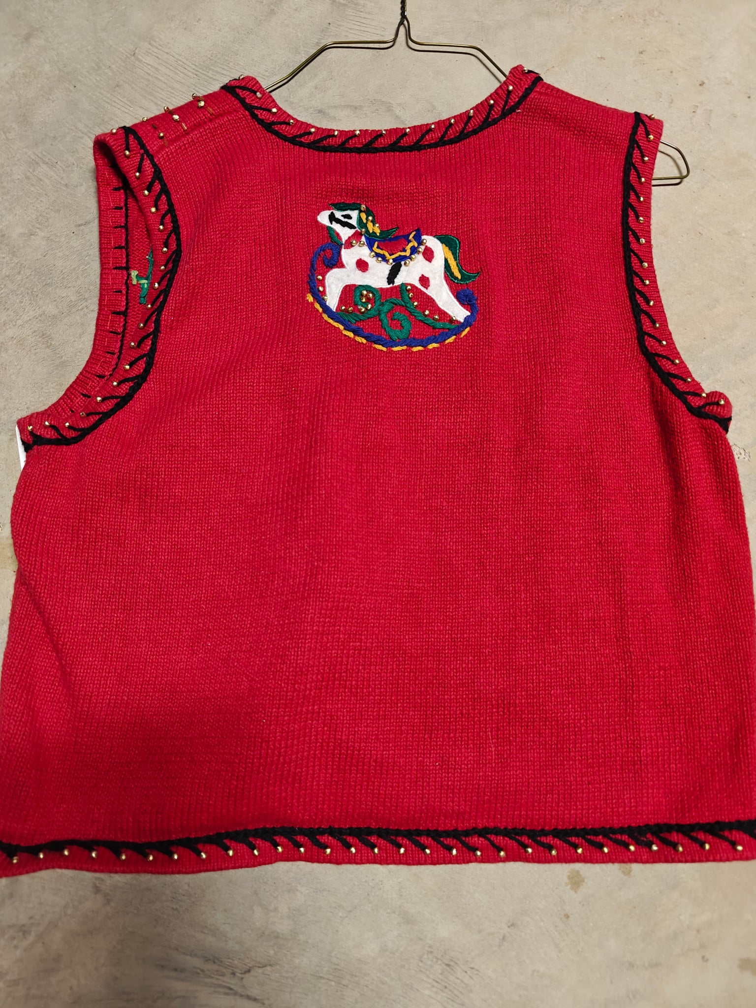 A ton of gold and red beads highlight the rocking Horse,Christmas tree, bells and Ornaments. Design on back. Vest. Chest = 37", Length = 19"