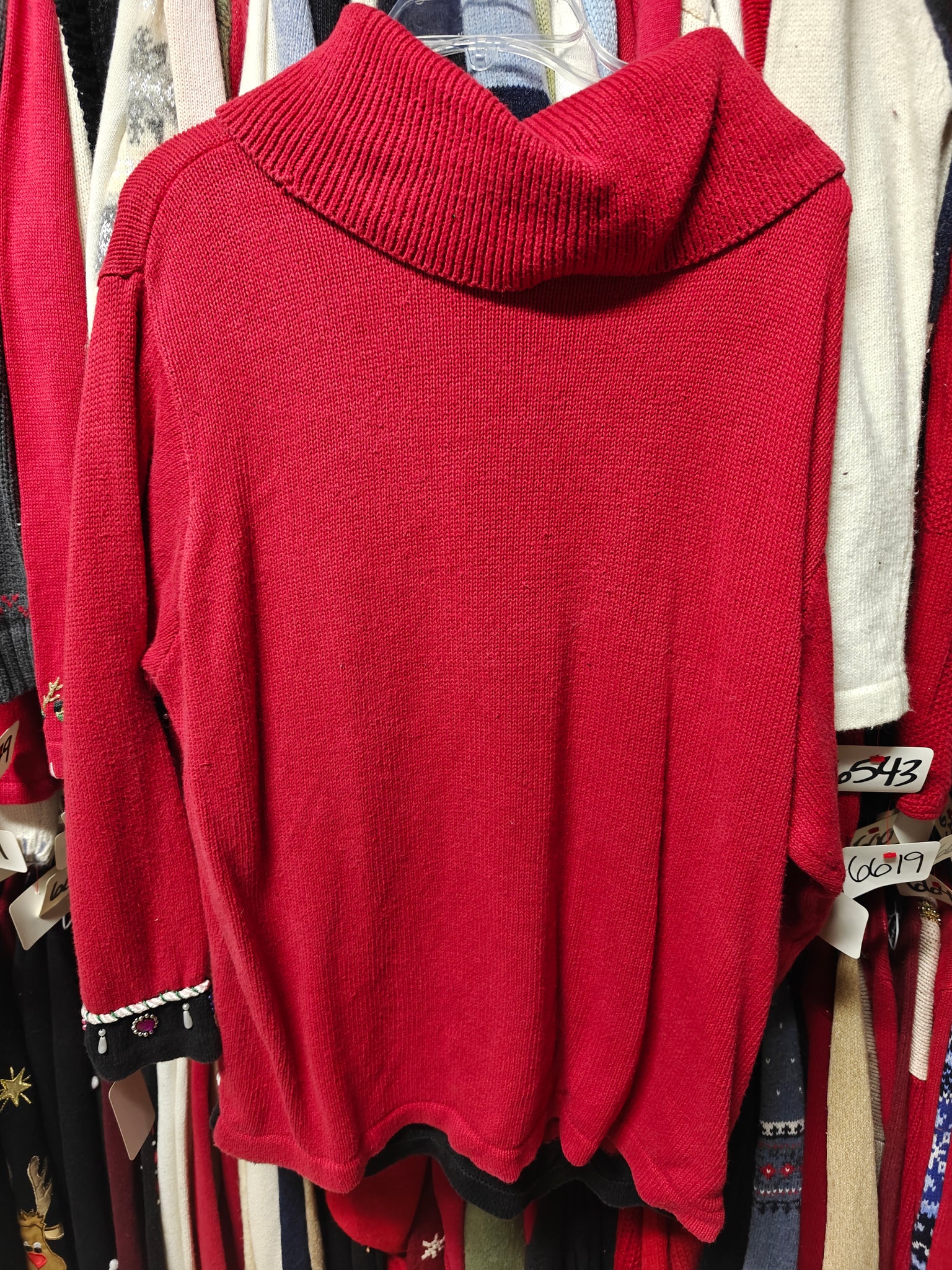 This is a spectacular Beaded and Jeweled Christmas Sweater. Jewels and beads along the bottom and cuffs. Chest = 52" Length = 25"